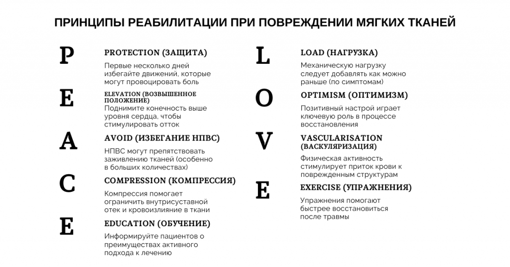В основе лечения всегда находится регулярное выполнение специальных упражнений, поскольку именно лечебная физкультура и принципы PEACE and LOVE являются базовыми компонентами потенциально успешного лечения боли в колене.