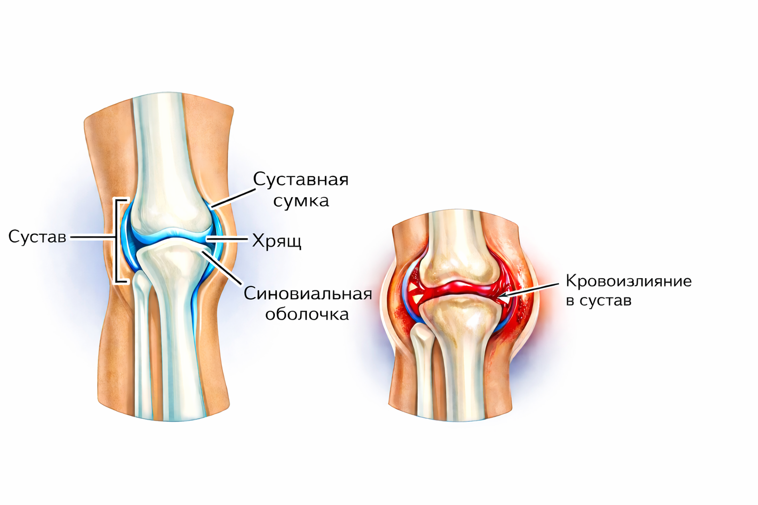 Коленный сустав — сложная биомеханическая система. Внутри него находятся мениски, связки, суставной хрящ и синовиальная оболочка. При травме повреждаются сосуды этих структур, и кровь попадает в суставную полость.