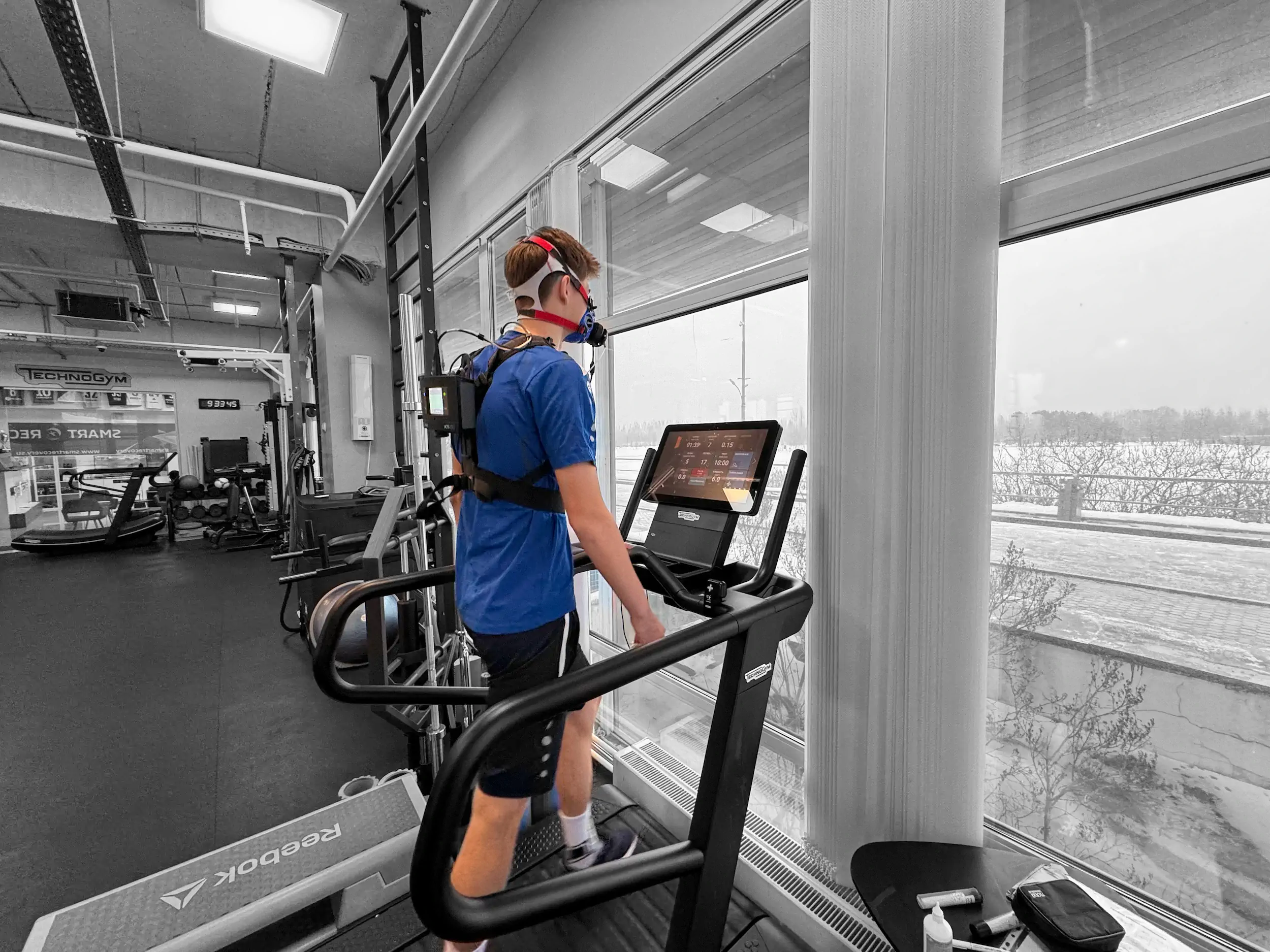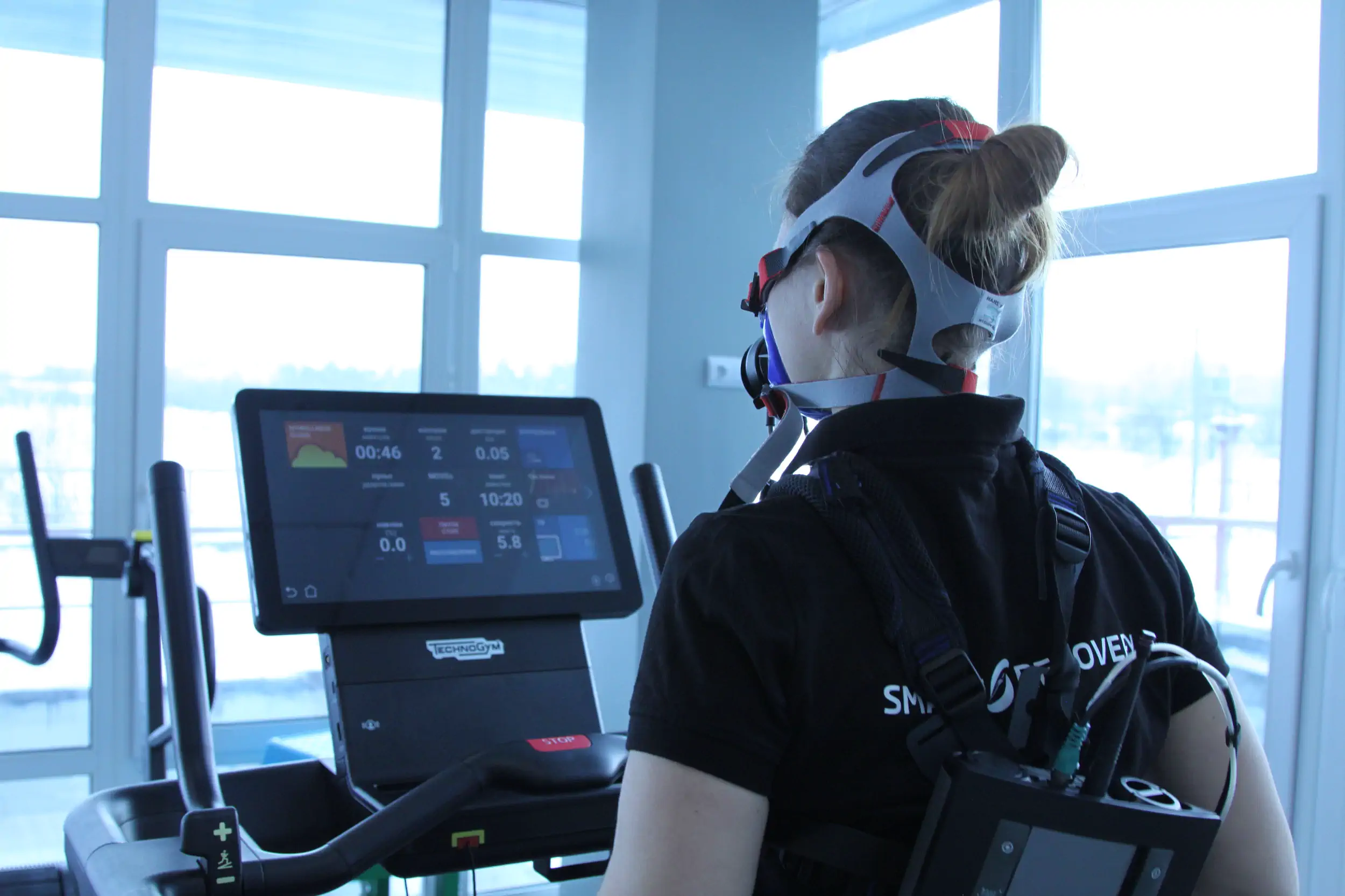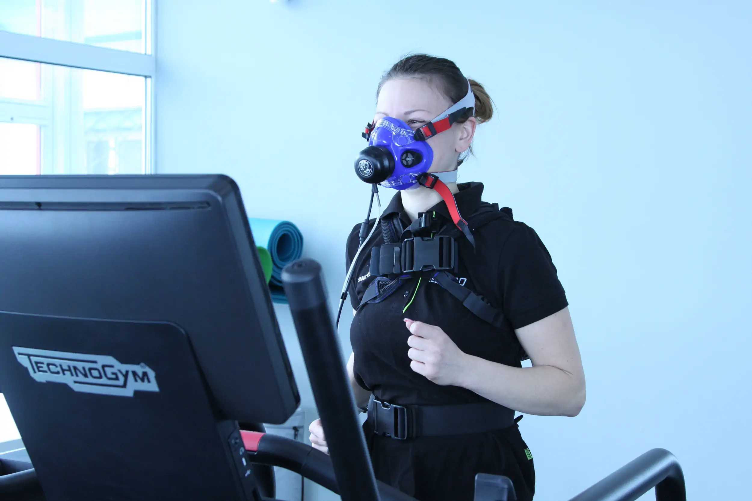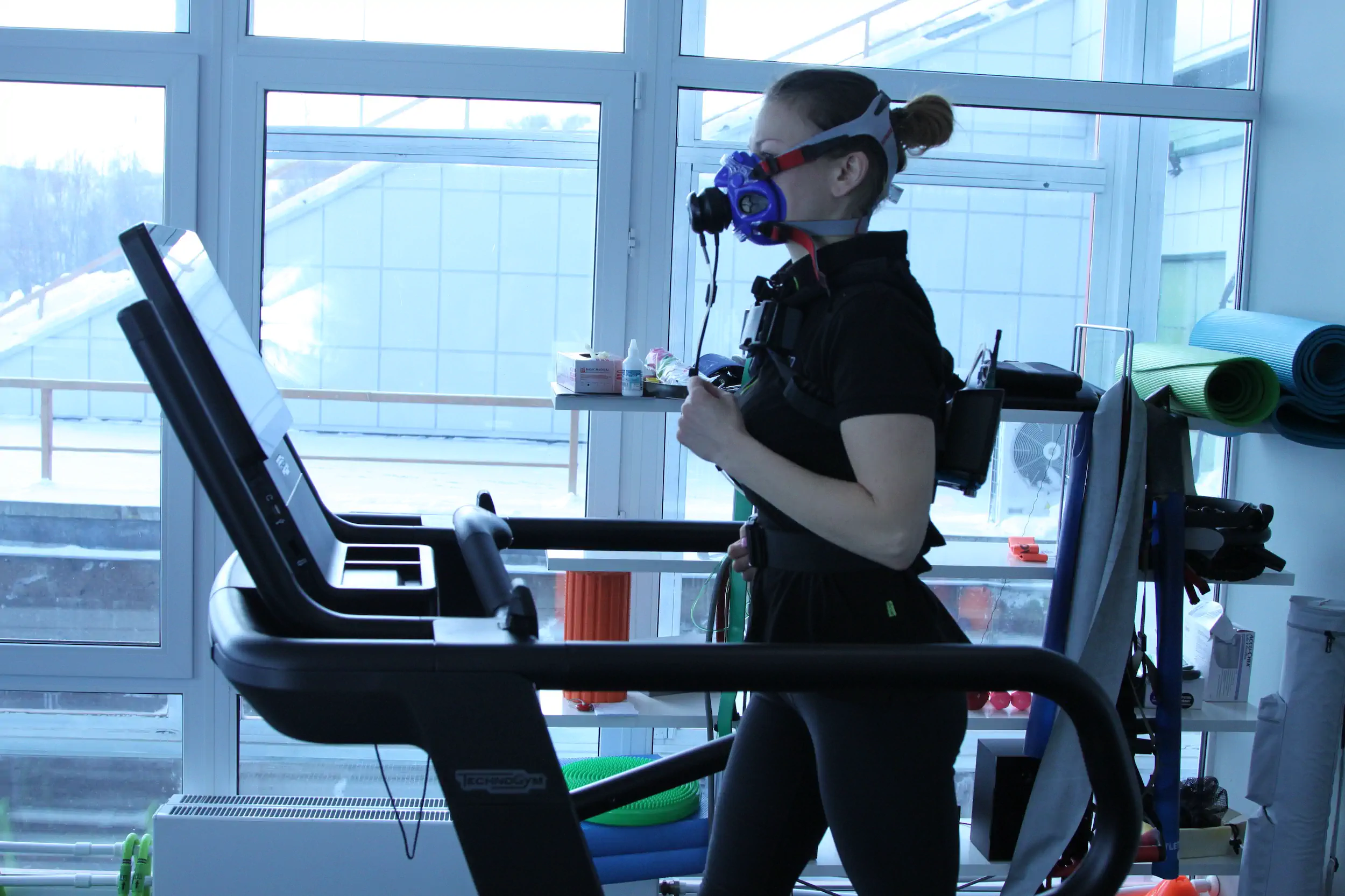 Газоанализ во время теста: специальная маска измеряет количество вдыхаемого кислорода и выдыхаемого углекислого газа, позволяя рассчитать потребление кислорода в реальном времени.