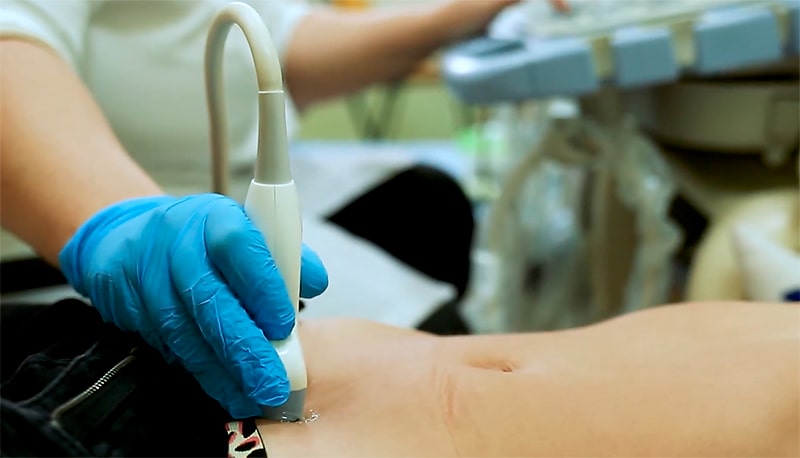 У женщин исследование может проводиться трансабдоминально (через переднюю брюшную стенку) или трансвагинально — для более детальной визуализации.